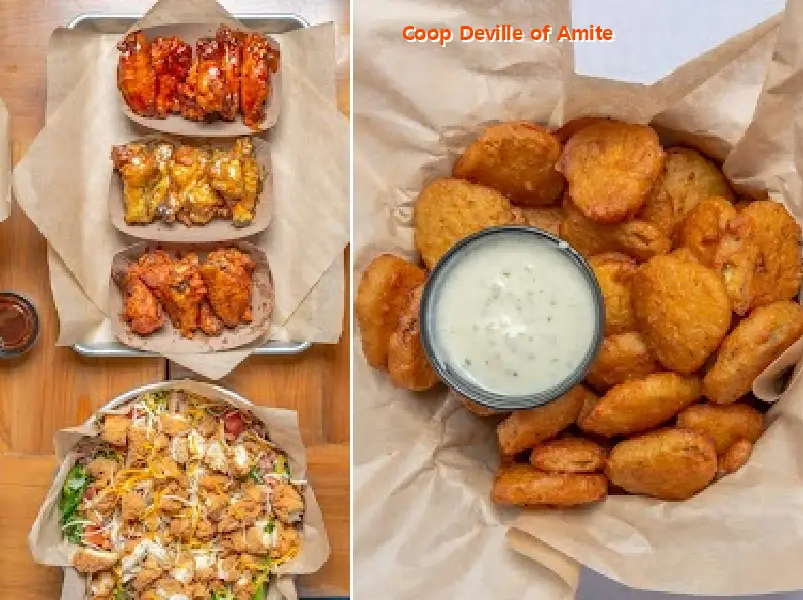 4 /5 Jollean Smith: I have been looking for great dry wings since moving to the South from Canada and Coop De Ville had it. Their Dry Wings were perfectly seasoned. Loved the Lemon Pepper and Garlic Pepper. Fries were very crisp. Food was hot and came in good time. Atmosphere is simple and staff busy, but friendly.